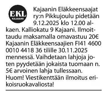 Kajaanin Eläkkeensaajat ry:n Pikkujoulu pidetään 9.12.2025 klo 12.00 alkaen. Vaihdetaan lahjoja joten pyydetään jokaista tuomaan n. 5€ arvoinen lahja tullessaan. Tervetuloa viettämään pikkujoulua kanssamme.